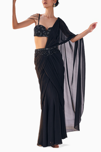 Featuring Black Regal Georgette Draped Saree by Mandira Wirk. Elevate your style with our black draped saree crafted from royal georgette fabric. This opulent ensemble features an embroidered bustier adorned with beads and highlighted with intricate hem detailing. With a statement belt to complete the look, it exudes regal elegance, perfect for any special occasion.