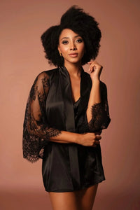 A sleek black robe with dramatic Chantilly lace sleeves. The perfect layer to elevate your nightwear.