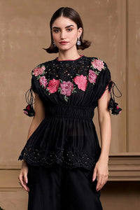 This black Chanderi top is a captivating blend of elegance and intricate detailing, featuring rose threadwork, beadwork, and cutwork that create a rich texture. The ruched design adds a flattering, form-enhancing silhouette, while the tie-up detail offers a customizable fit and adds a modern, stylish touch. The delicate black Chanderi fabric enhances the luxurious feel of the top, making it perfect for both formal and semi-formal occasions.