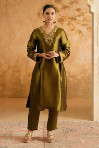 The Black Rose Chevron Tissue Kurta with Narrow Pants is a stunning blend of traditional craftsmanship and modern elegance. The kurta, crafted from rich chevron tissue fabric in a striking black rose hue, exudes luxury and charm. It is beautifully embellished with intricate Aari embroidery and Adda detailing along the neckline and cuffs, showcasing exceptional craftsmanship. Paired with sleek, narrow-fit pants, this ensemble offers a polished, contemporary silhouette, making it the perfect statement piece for any festive celebration.