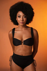 Supportive high-waist bikini with textured ruching, all in midnight black. Crafted using premium Italian Carvico fabric, this piece offers excellent stretch, resistance to chlorine and abrasion, UV protection, a quick-dry finish, and an incredibly soft hand feel — blending performance with luxury.