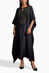Featuring Black Sabina Embellished Kaftan Set in Habutai Silk, Chantilly Lace. Hand Embellished in Black hues. Kaftan has chantilly lace detailing. Paired with complementing pants.