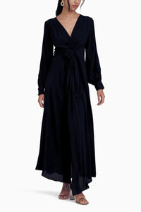 The Sahara dress is delicately crafted with luxurious, natural fabric and accentuated with a flowy silhouette. This dress features an open kimono style tie-up closure, pleating on the shoulders, and voluminous cuffed sleeves for an opulent and relaxed fit.