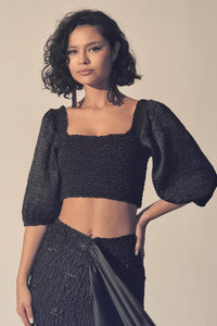 Featuring the Black Satin Pearl Balloon Sleeve Top from ACQUIRE's Lot-5 Collection, this exquisite square-neck top combines classic elegance with modern design. The dramatic balloon sleeves are beautifully hand-smocked and intricately hand-embroidered with tonal pearls, adding texture and sophistication. Perfect for both formal and casual occasions, this top offers a luxurious touch to any outfit, blending refined craftsmanship with timeless style.
