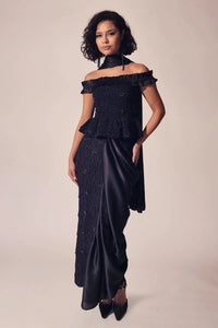 Featuring the Black Satin Pearl Balloon Sleeve Top from ACQUIRE's Lot-5 Collection, this stunning square-neck top combines contemporary design with exquisite craftsmFeaturing the Black Satin Pearl Peplum & Sari Skirt Set from ACQUIRE's Lot-5 Collection, this stunning ensemble combines elegance and modern craftsmanship. The Black Satin Pearl Peplum Top is designed with an off-shoulder silhouette and enhanced with ruffled details, hand-smocking, and delicate hand-embroidered tonal pearls, offering a perfect balance of sophistication and charm. Paired with the Black Satin Pearl Sari Skirt, this pencil skirt is hand-smocked and intricately embroidered with tonal pearls, with an attached 5-meter half-drape pallu for effortless draping and graceful movement. Ideal for any special occasion, this set embodies refined luxury and timeless beauty. The dramatic balloon sleeves are intricately hand-smocked and embroidered with tonal pearls, adding texture and elegance. Perfect for both casual and formal occasions, this top offers a luxurious blend of style and sophistication.