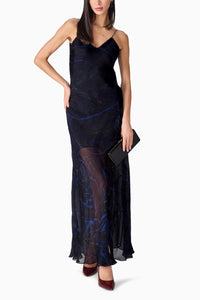 Featuring the Black Scratch Flower Vihanna Dress by Saaksha & Kinni's Nirah Collection. This asymmetric slip dress showcases an abstract floral print with delicate noodle straps and sheer layer detailing, offering a graceful and contemporary silhouette.