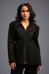 Featuring semi-sheer geometric cutout jacket with structured zipper closure and vibrant coloured lining.