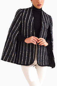 Black sequence tweed cape With front armhole cut, Lace detailing in the front, Regular fit with extra ease. Perfect to make you growl and shine in any party