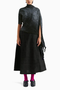 Elevate your style with our free-size black silk top, designed to make a bold statement. This striking piece features an asymmetrical neckline and sleeves, creating a modern, avant-garde silhouette. Adorned with an all-over shibori pattern, it embodies a unique blend of traditional artistry and contemporary design. The shapeshifter fit ensures that this versatile top flatters all body types, making it the perfect choice for days when you want to stand out with confidence and sophistication.