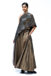 A zero-waste uni shoulder top featuring fragments of handwoven metallic textiles in tonal textures.