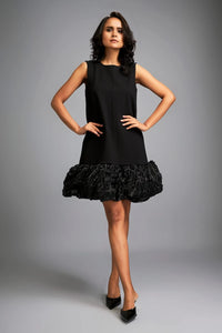 Featuring the Black Shimmer Ruffled Mini Dress by Deepika Arora's Shimmer and Sequins Collection. This sleeveless black mini dress makes a bold impression with its sleek silhouette and voluminous, textured shimmer hemline. The dramatic ruffled detailing adds movement and flair, creating a perfect balance of edgy elegance for evening events and glamorous nights out.