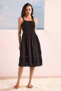 Embrace effortless elegance with this Black Short Dress, a perfect blend of comfort and style. Featuring delicate schiffli lace detailing, adjustable shoulder straps, smocked bodice and a flowy silhouette, this dress is ideal for beach vacations, brunch dates, or summer soirées. Pair it with strappy sandals and a woven tote for a breezy daytime look, or elevate it with statement earrings and block heels for an evening out.