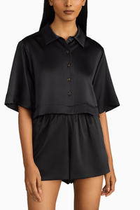 Featuring the Black Silk Cropped Bowling Shirt by Refined Revolution. This elegant piece is crafted from 100% silk charmeuse satin, featuring shell effect buttons and an A-line fit with back yoke gathers. Designed for a relaxed fit, true to size.