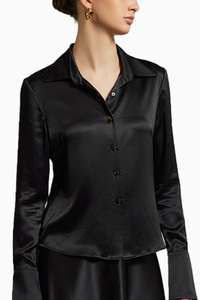 Featuring the Black Silk Long-Sleeved Shirt by Refined Revolution. Revel in sophistication with this long-sleeved shirt crafted from 100% silk charmeuse satin. With oversized collar and cuffs, adorned with shell-effect buttons. True to size, but size up for a relaxed fit.