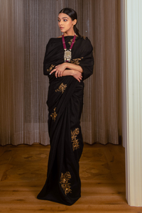 The habotai silk saree in black has floral hand embroidered motifs placed all over highlighted with zari and sequins. It comes with 1 metre blouse fabric.