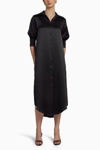 Featuring the Black Silk Shirt Dress by Refined Revolution. Elevate your style with this timeless shirt dress, crafted from 100% silk charmeuse satin. Adorned with elegant shell-effect buttons, it offers versatility with the option to wear with or without a separate sash belt. Designed for a true-to-size, relaxed fit, exuding effortless sophistication.