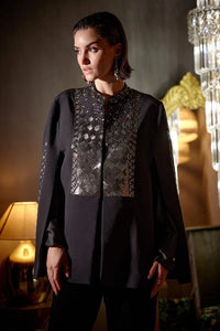 Featuring the Black Sim Crepe Cape by ANAHE, this striking cape features a bold ember lode red yoke, creating a unique contrast. The sophisticated crepe fabric and modern design offer a stylish, elegant look perfect for any occasion.