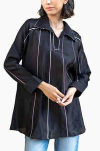 Featuring Black Sirius Shirt by URAIB. Immerse yourself in sophistication with this Chanderi fabric shirt in timeless black. Versatile and stylish, it's a wardrobe essential for any occasion.