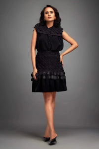 Black Sleeveless Buttoned Top with Applique Skirt