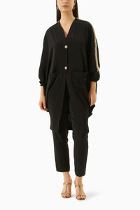 Featuring a blend of feminine styling and striking pattern brings a joyful finish to the Kimono set. Designed with a relaxed and lightweight fabric that drapes effortlessly over your frame, this comfortable and versatile set includes an open front kimono jacket and a dress that's expressed with a  antique gold detailing on sleeves and black and gold metallic buttons. Ankle length pants and matching inner. Pair it with strappy sandal heels.