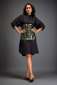 Featuring the Black Structured Gleam Layered Shirtdress from Deepika Arora's Metallic collection, this bold look layers a classic black shirtdress with a striking metallic green corset featuring geometric cutout detailing. Made from 100% Cotton and Vegan Leather, the ensemble is tailored for a true-to-size fit with a modern architectural flair.