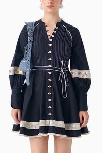 Radiate warmth in the Sunflare Black Embroidered Short Dress, crafted from soft cotton satin. This fit-and-flare design features a pintuck yoke, delicate lace-trimmed hem, and balloon sleeves with intricate embroidery and lace insertions. Side pockets add function, while front show buttons and a back zipper ensure effortless style and wearability.