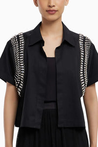 Refined and effortlessly chic, this shirt features a Classic Collar and Half Sleeves, offering a timeless and sophisticated silhouette. The highlight of this piece is its exquisite shoulder embroidery, which gracefully transitions into a delicate, crystal-encrusted fade-out effect, creating an ethereal and opulent look. Versatile in design, this shirt can be worn as a standalone statement top or elegantly layered as a luxurious jacket, making it a must-have addition to any wardrobe. Paired with black soft tulle skirt