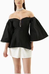 One of our favorites this season is the 'Tahi' corseted off-the-shoulder top. A romantic black shirt with white details,  cut to elegantly highlight your décolletage bringing out your most feminine self.