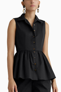 The sleeveless cotton top with collar in black is crafted from 100% Egyptian Giza Cotton with a fine 120/2 thread count, featuring elegant mother of pearl buttons, and designed to be fitted at the bust while being gathered and flared at the waist for a polished, feminine look.