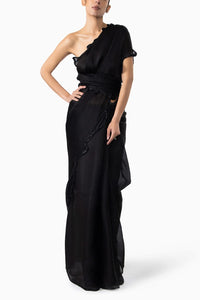 An exquisite blend of tradition and modernity, the Thousand Crescents Saree in luxurious silk drapes gracefully, featuring intricate hand-embellished surface designs along the borders that seamlessly blend throughout the yardage.