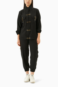 Shivya K's tracksuit is reversible and serves up two iconic looks. Crafted from black luxury crepe fabric, the slouchy silhouette references the designs of the 80s, with bold vintage leather & metal buckle detailing and energetic style. Shrug the jacket on over a tank top and your favorite sport shoes.
