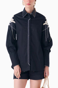 Featuring a Cotton Satin Treetop black embroidered shirt in a relaxed fit. This standout piece showcases intricate tree embroidery, statement sleeves, subtle stitch line details, and a concealed placket for a sleek, modern look.