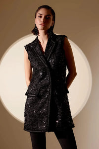 Featuring the Black Tweed Stardust Vest by ANAHE, this chic tweed blazer vest combines timeless style with a modern twist. Its tailored fit and refined design make it the perfect versatile piece for both casual and formal occasions.