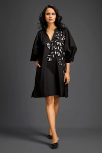 Featuring puffed sleeves and metallic floral embroidery on the shoulder, this black V-neck dress combines timeless elegance with a subtle shimmer for a sophisticated, modern look.