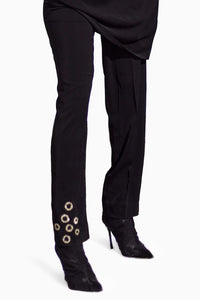 Vera pants are classic black pants with a modern twist. Side zipper opening straight pants with pockets. Silver embroidered patches to match the vera one-shoulder top and complete the look.