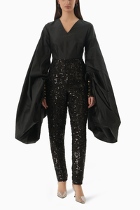 Featuring the Black Wanderer Jumpsuit by Renasci from the Untamed Collection. Embrace sophistication in Taffeta Silk and Tweed Sequence Pants, creating a fitted, timeless allure in elegant black. Elevate your style effortlessly with this one-piece wonder.