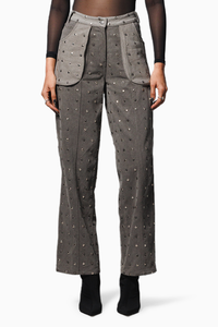 Featuring the Black Washed Denim Studded Pants by Mellow Drama from their A/W'24 Collection - Catalyst. Crafted from 100% Cotton denim, these mix-and-match washed pants make a bold statement with all-over studding. With a mid waist, utility pockets at the front and back with dart detail, a front opening featuring a zipper and statement logo button, and wide leg bottoms, they seamlessly combine edgy style with comfort. Redefine your denim look with these chic and studded pants.
