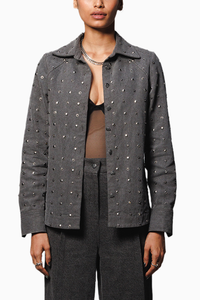 Featuring the Black Washed Denim Studded Shirt by Mellow Drama from their A/W'24 Collection - Catalyst. Crafted from 100% Cotton denim, this washed shirt is a bold statement piece. Adorned with all-over studding, it features front openings with statement logo buttons and full sleeves with statement logo buttons at the cuffs. Redefine denim sophistication with this edgy and chic studded shirt.