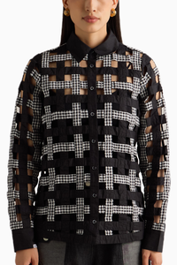 Featuring the Black Weave Shirt by MellowDrama's by Utopia Collection. Made from 100% cotton, this full-sleeve shirt showcases handcrafted weave detailing. It features a front opening with buttons, a curved bottom hem, and offers a regular fit for versatile and comfortable wear.