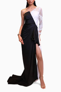 Bold yet timeless, this Monochrome Draped Gown is the epitome of modern elegance. Featuring a unique fusion of black and white panels, this gown stands out with its asymmetrical one-shoulder design and artful draping. The right sleeve is crafted in intricate white lace, offering a touch of femininity to the strong silhouette. The pleated drape detail adds drama, while the sleek fit ensures a sophisticated finish. A statement piece for cocktail parties, receptions, or editorial styling.