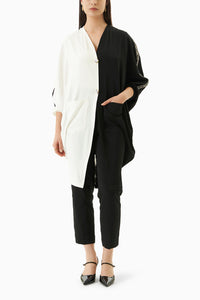 Featuring a blend of feminine styling and striking pattern of black and white colour block brings a joyful finish to the Kimono set. Designed with a relaxed and lightweight fabric that drapes effortlessly over your frame, this comfortable and versatile set includes an open front kimono jacket and a dress that's expressed with black and gold detailing on sleeves and metallic buttons. Ankle length pants with matching inner Pair it with strappy sandal heels.