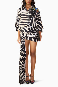 Featuring the Black & White Stripe Blake Shirt with Carlitta Skirt by Saaksha & Kinni's Akara Collection A/W'25. The batwing collared shirt features floral applique, paired with a pleated mini skirt and side trail- making a bold, balanced graphic statement.
