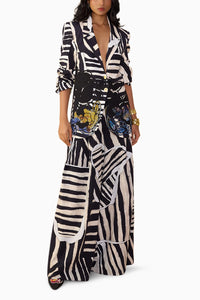 Featuring the Black & White Stripe Saylor Pants by Saaksha & Kinni's Akara Collection A/W'25. These abstract stripe print high-waist palazzo pants feature a wide-leg silhouette that delivers comfort, edge, and an effortlessly fluid fit for autumn styling.