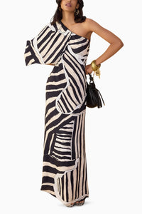 Featuring the Black & White Stripe Selna Dress by Saaksha & Kinni's Akara Collection A/W'25. This one-shoulder column dress features abstract stripe print and a kaftan-style sleeve, blending asymmetry and ease with striking graphic appeal.