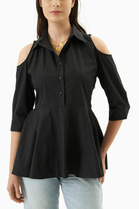 Featuring Zoe shirt which will give you a tailored look complemented by a peplum shape that celebrates the female form. Button detailing from bust to waist adds sophistication to popular cold-shoulder design.