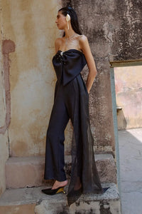 Featuring Black Zoya Jumpsuit by Ritika Arya Jain's RAYA collection, a sleek jumpsuit accented with a dramatic oversized bow adorned with crystal embellishments, complemented by a flowing organza drape that adds softness and graceful movement.