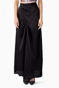 Featuring the Black Zuri Skirt by Saaksha & Kinni's Nirah Collection. This high-waisted asymmetric maxi wrap skirt showcases intricate pinch and fold detailing, offering a bold yet elegant silhouette perfect for versatile styling.