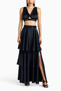 A long multi layered flared skirt, with a slit on one side. Cut in a satin, it flows beautifully on the body. Pair it with our embroidered blouses or shirts as a modern day lehenga.