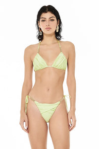 Shine bright in the Blaire Triangle Bikini Set, featuring a triangle top and bottom with elegant gathering details. Both pieces are adorned with gold chain embellishments and gold tassels at the tie cord ends for a luxurious, polished look.