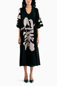 This classic monochromatic A-line midi dress features a flattering V neckline and elegant bell sleeves, crafted from soft, breathable cotton mul fabric. Adorned with a bold statement print, it adds a touch of sophistication to the design. The dress is fully lined for added comfort and structure, and includes side seam pockets for practicality, blending style and functionality seamlessly.